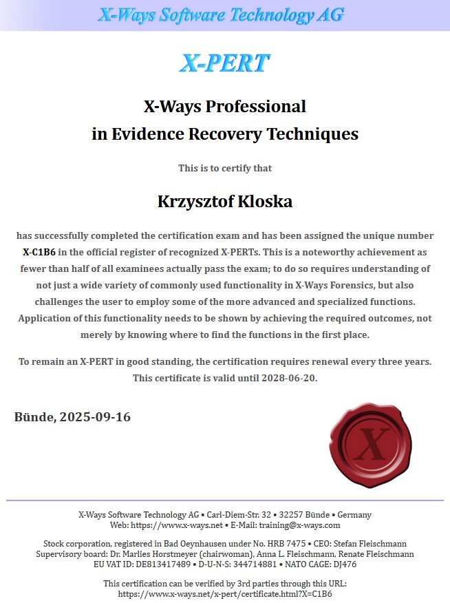 Posiadam aktualny certyfikat X-Pert wydany przez producenta programu X-Ways.